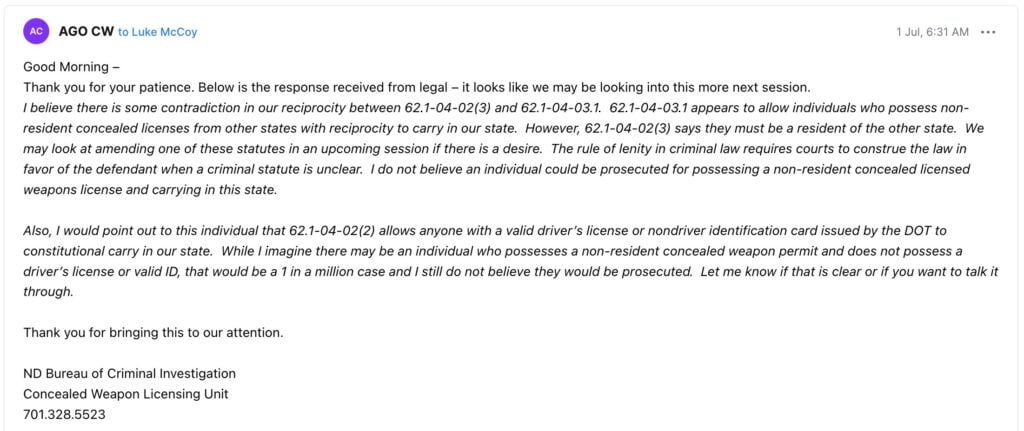 To clear this up, I contacted the North Dakota Attorney General’s office directly. Here’s a portion of the response I received from the Concealed Weapon Licensing Unit: