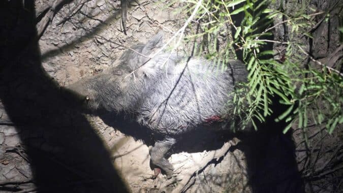 Thankfully, tracking the blood wasn’t too hard since it was clear that the hog was not long for this earth. Around 150 yards or so of blood trail led us deep into the thorny Texas bush with only one headlamp between us to light the way. But with the help of the men in the blind, we found her dead among the whitethorn acacia bushes.