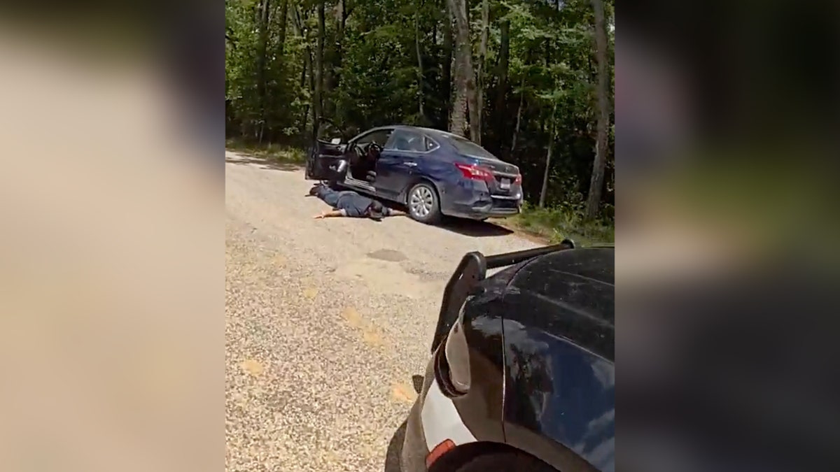 man laying on road face down next to dark colored car