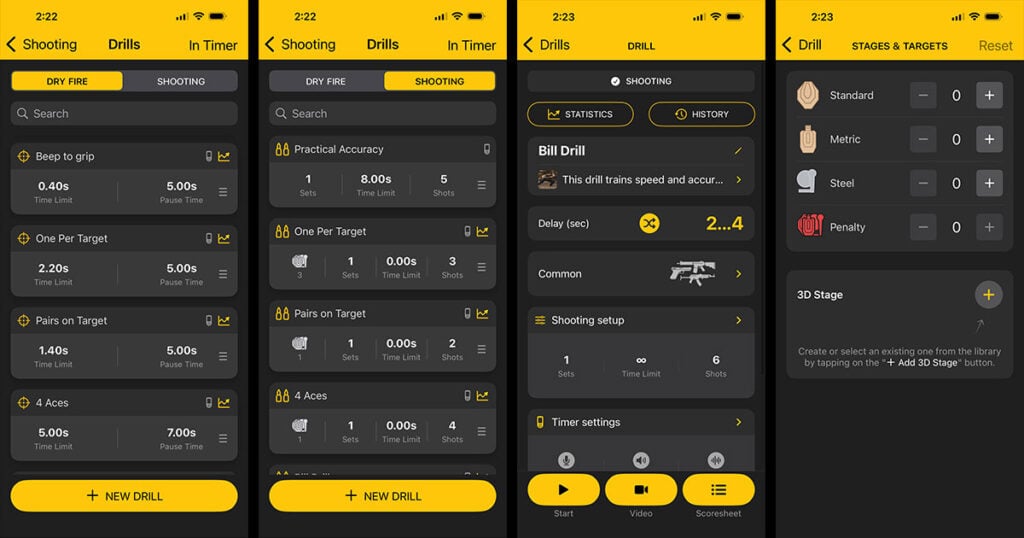One of the most recent updates is the ability to create your own drills for dry fire or live fire. You can customize them with shot count, par times, sets, and more. There are also nine built-in live fire drills in the app, explained by Lena Miculek. She even recorded a YouTube video going over all of them. Drills include: