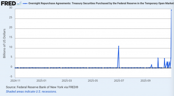 That’s a big number and it signals something I’m watching closely. According to the data for “Overnight Repurchase Agreements — Treasury Securities Purchased by the Fed” the figure for Oct 31, 2025 is $29.400 billion.