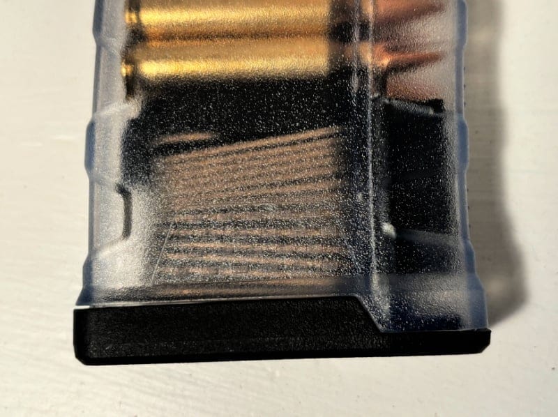 Let’s start with these magazines’ biggest selling feature: transparency. Yes, they say they are “translucent,” but that’s incorrect. Allow me to digress for a moment while I take the industry to task. It’s not just Mission First Tactical’s fault that they mislabeled their magazines. I’ve seen this with plenty of other non-opaque magazines from various manufacturers. The word is not “translucent.” It’s “transparent.” Translucent means light passes through, but you can’t make out any details about what’s behind the surface.