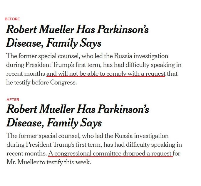 Former FBI Director and Trump special counsel Robert Mueller claims he has Parkinson’s disease, and “cannot comply with a request to testify this week before a congressional committee investigating the government’s handling of the Jeffrey Epstein investigations,” the NY Times originally reported Sunday evening before stealth-editing their article to lead with the committee having withdrawn their request.