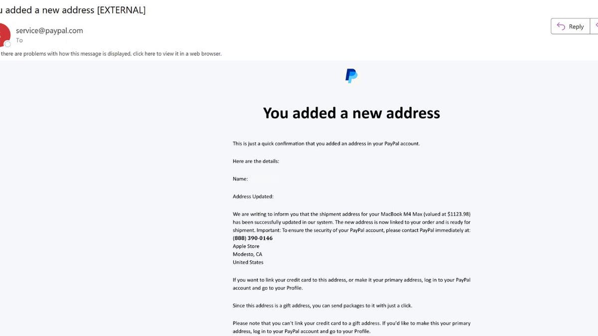 Panic bait: The message often claims a new address was added, or a large payment is being processed, getting your attention and provoking a quick reaction.