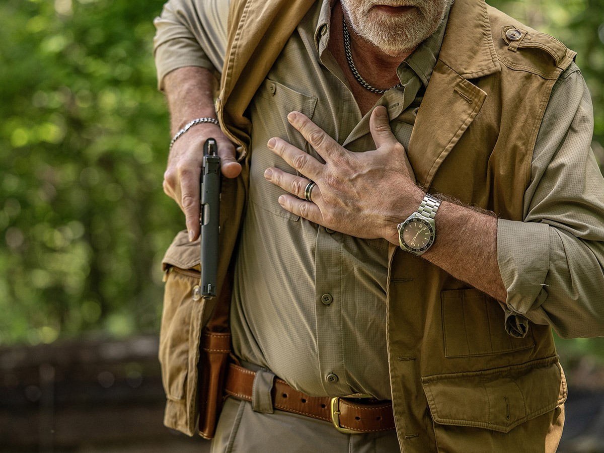 When drawing from concealment, you must use either your support or shooting hand to uncover the handgun. If you’re drawing from your waistband and wearing a cover garment with an open front—like a vest or jacket—use your shooting hand to sweep the garment past your holster.