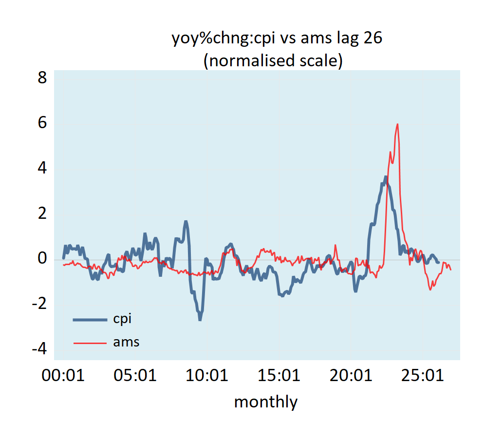 After rising to 79 percent in February 2021, the yearly growth rate of the US money supply AMS followed a visible downtrend until mid-2023, before strengthening until mid-2024, before a renewed softening emerged. Given the long time lag from changes in money supply and its effect on the momentum of the CPI, the yearly growth rate in the CPI is likely to be strongly influenced by the lagged momentum of the AMS in the months ahead, which suggests it may remain elevated in the short term before a softening emerges towards the end of the year. Note that changes in money supply do not affect prices instantly. When money is injected, it moves from one market to another market.