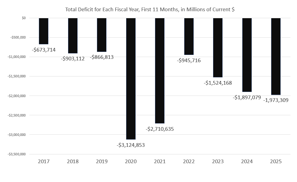 Yet, the Fed is increasingly showing that price inflation is not even one of the central bank’s chief concerns. If the Fed cuts the target federal funds rate on Wednesday, we will know that what really matters for the Fed is not price inflation. What really concerns the Fed is ensuring the Treasury has access to cheap credit while attempting to help the administration politically by temporarily driving up employment numbers with ever-higher levels of monetary inflation.