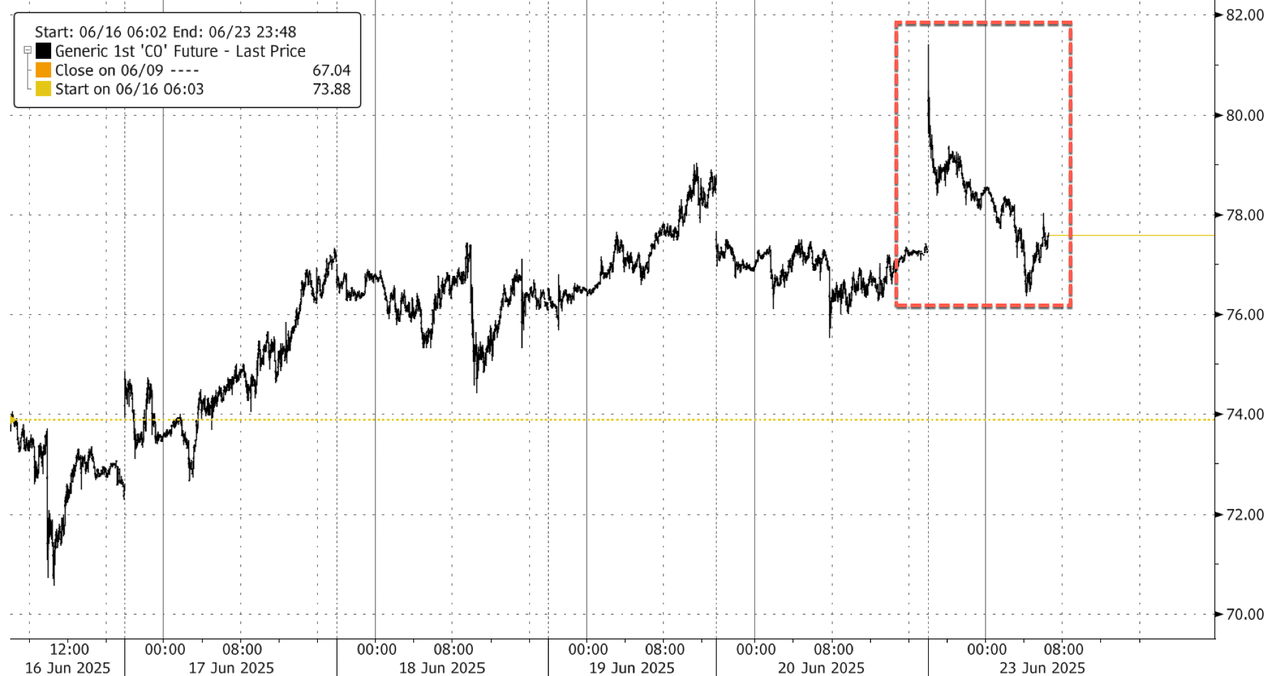 In the overnight, Brent crude futures reversed sharply—now trading around Friday’s close and down 6% or so from intraday highs. UBS Research warned that the real left-tail risk remains a Strait of Hormuz closure, which would trigger a disruption larger than the 2022 Russian supply shock and could send prices soaring above $120.