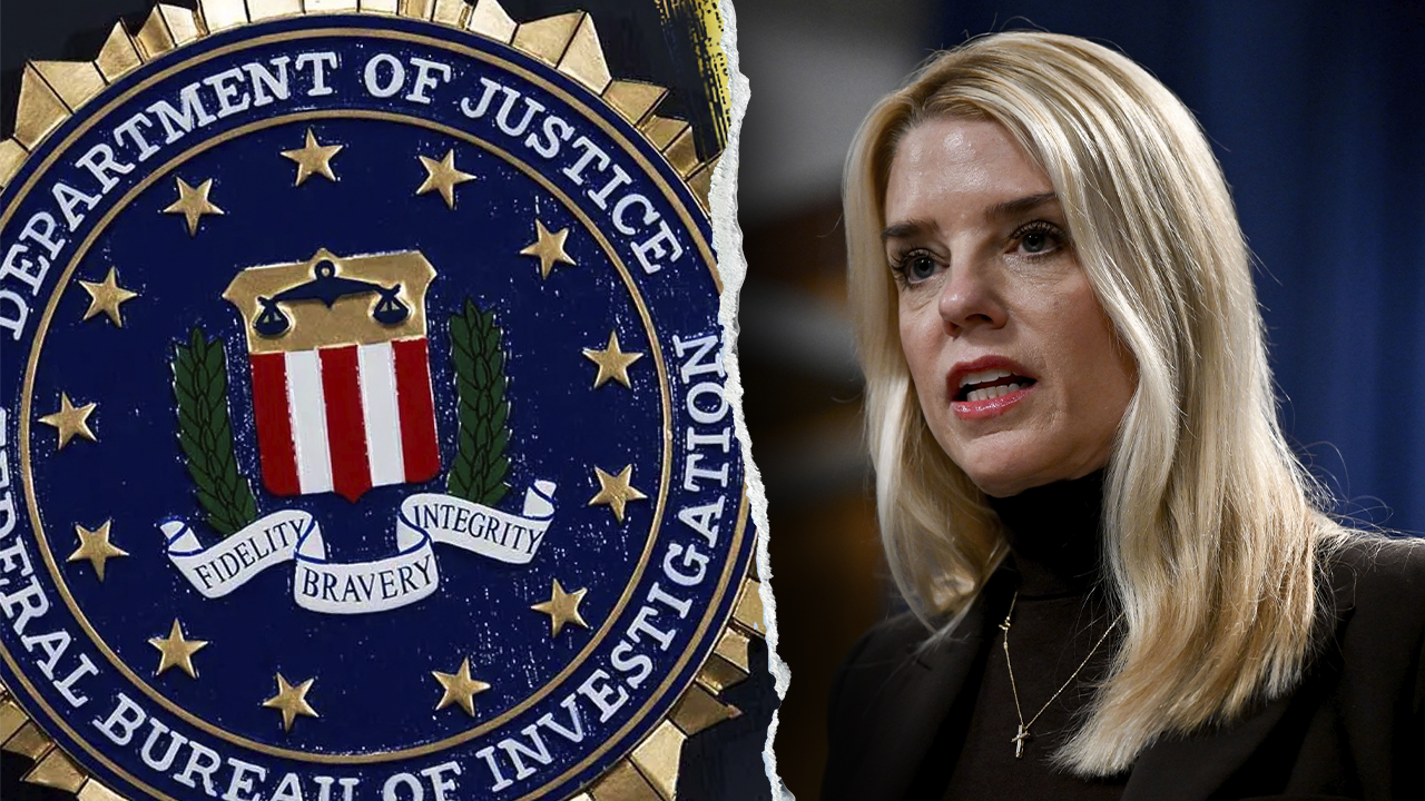 US President Donald Trump and US Attorney General Pam Bondi (L) arrive to speak at the Department of Justice in Washington, D.C. (Roberto Schmidt/AFP via Getty)