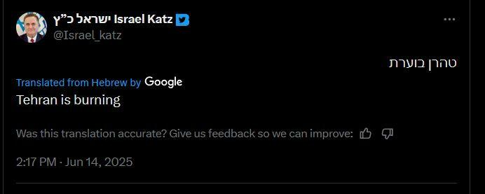 Israeli Defense Minister Israel Katz wrote on X, “Tehran is ablaze” amid reports of the strike on the oil depot.