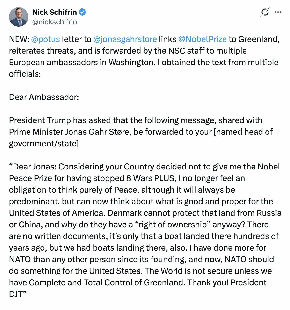 “I can confirm that this is a text message that I received yesterday afternoon from President Trump. It came in response to a short text message from me to President Trump sent earlier on the same day, on behalf of myself and the President of Finland Alexander Stubb. In our message to Trump we conveyed our opposition to his announced tariff increases against Norway, Finland and select other countries. We pointed to the need to de-escalate and proposed a telephone conversation between Trump, Stubb and myself on the same day.