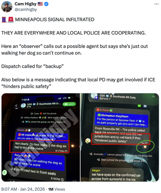 Let’s begin with citizen journalist Cam Higby’s bombshell reporting, who says he “infiltrated organizational signal groups all around Minneapolis with the sole intention of tracking down federal agents and impeding/assaulting/and obstructing them.”