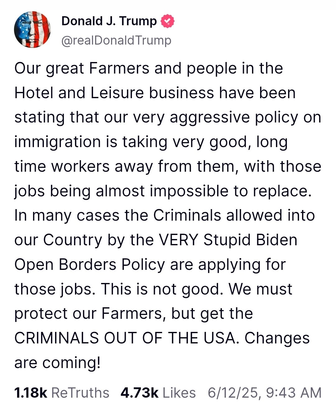 Our great Farmers and people in the Hotel and Leisure business have been stating that our very aggressive policy on immigration is taking very good, long time workers away from them, with those jobs being almost impossible to replace. In many cases the Criminals allowed into our Country by the VERY Stupid Biden Open Borders Policy are applying for those jobs…